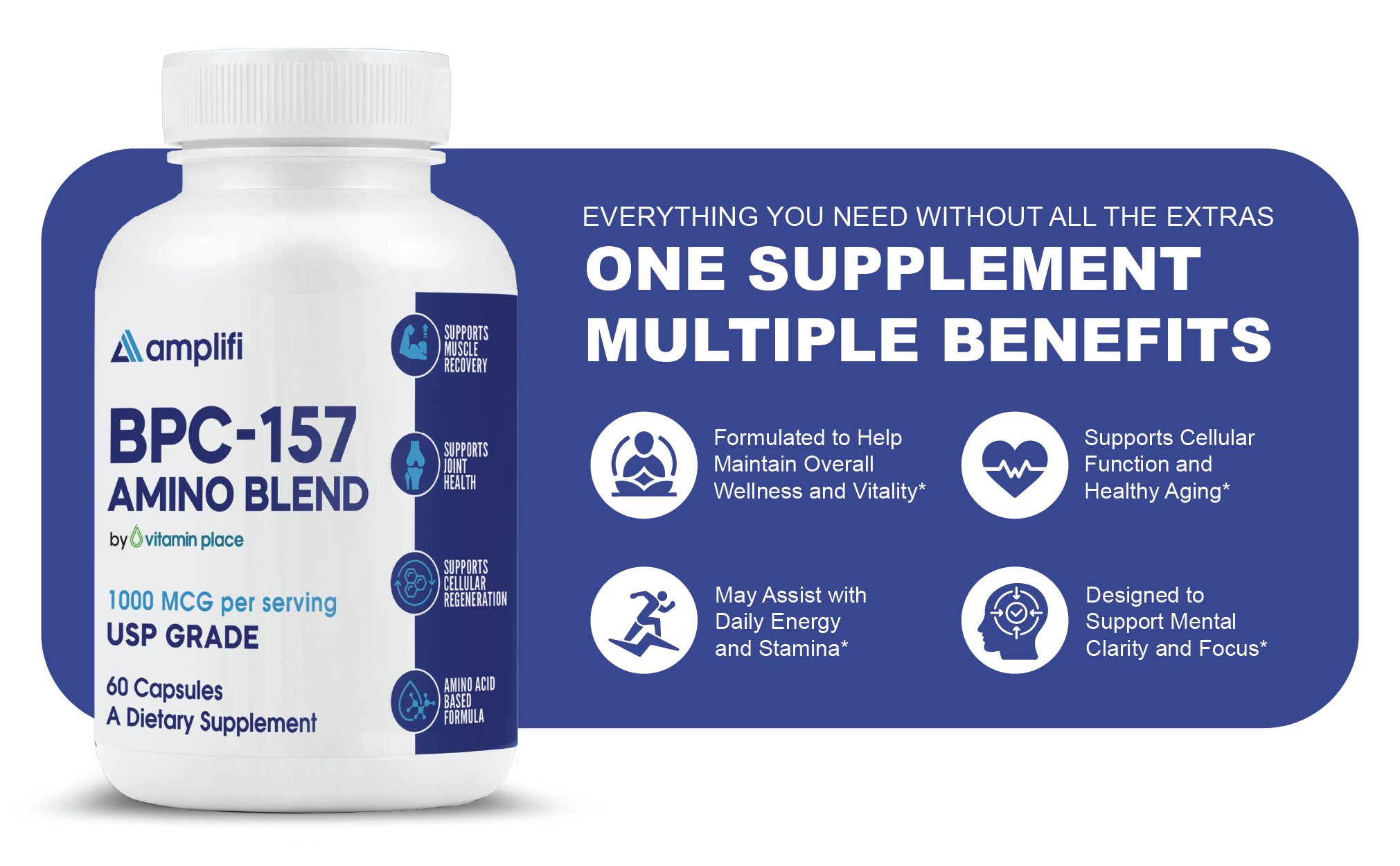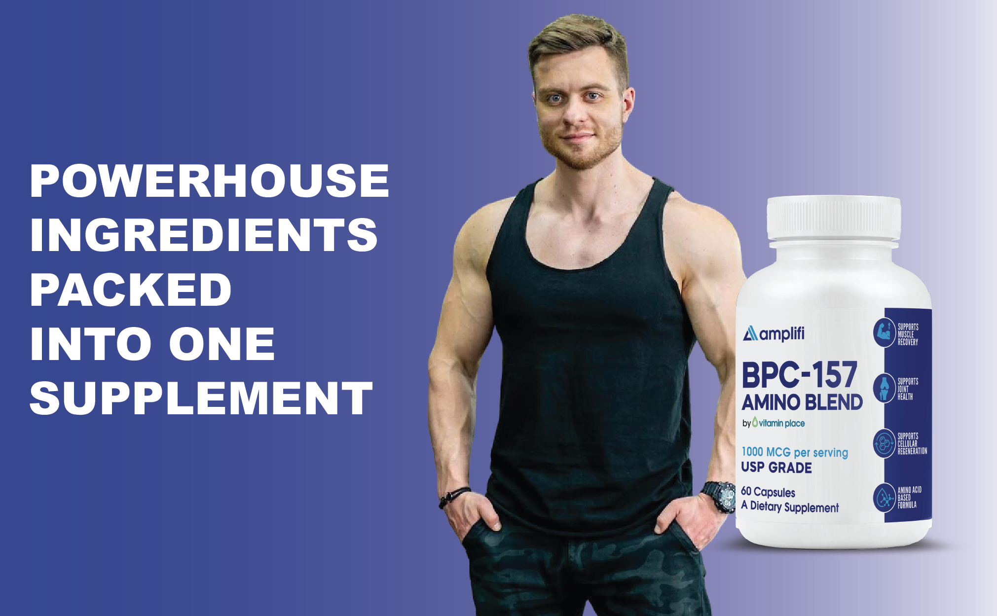 Support your active lifestyle with Amplifi BPC-157 Amino Blend, a premium USP-grade dietary supplement formulated to promote muscle integrity, joint health, and cellular regeneration support.